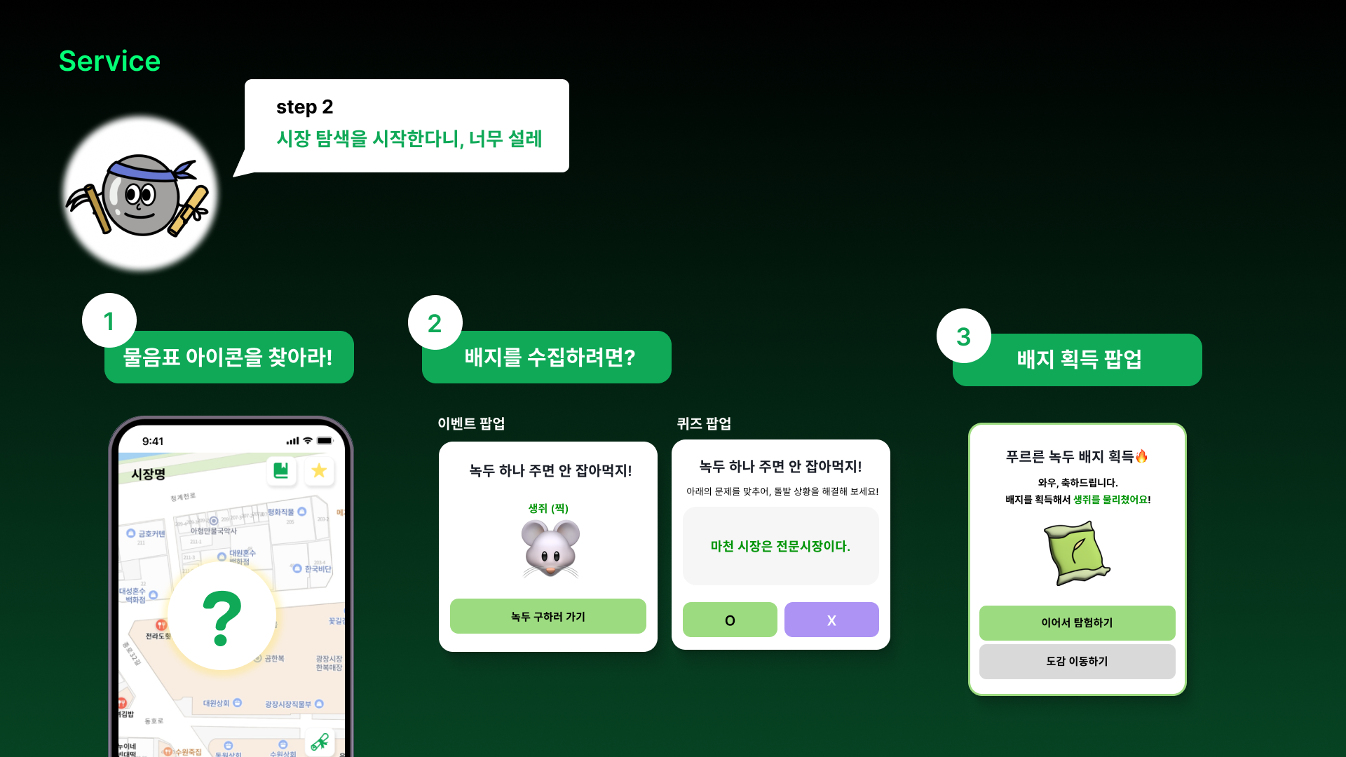 이때, MZ세대를 공략하고자 게임적인 요소를 활용하여 전통시장을 새롭고 재미있는 경험으로 제공함으로써,
