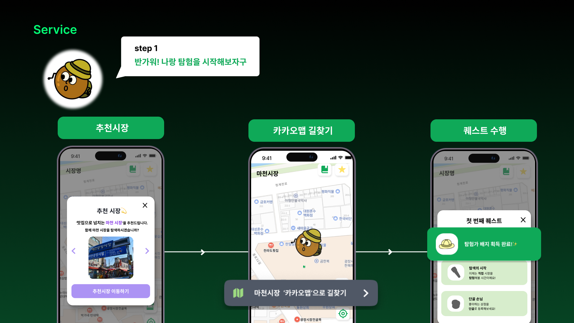 탐험의 준비단계입니다. 온보딩 이후 주변 시장을 추천해 주고 카카오 맵에서 시장 길찾기로 연결해 줍니다.