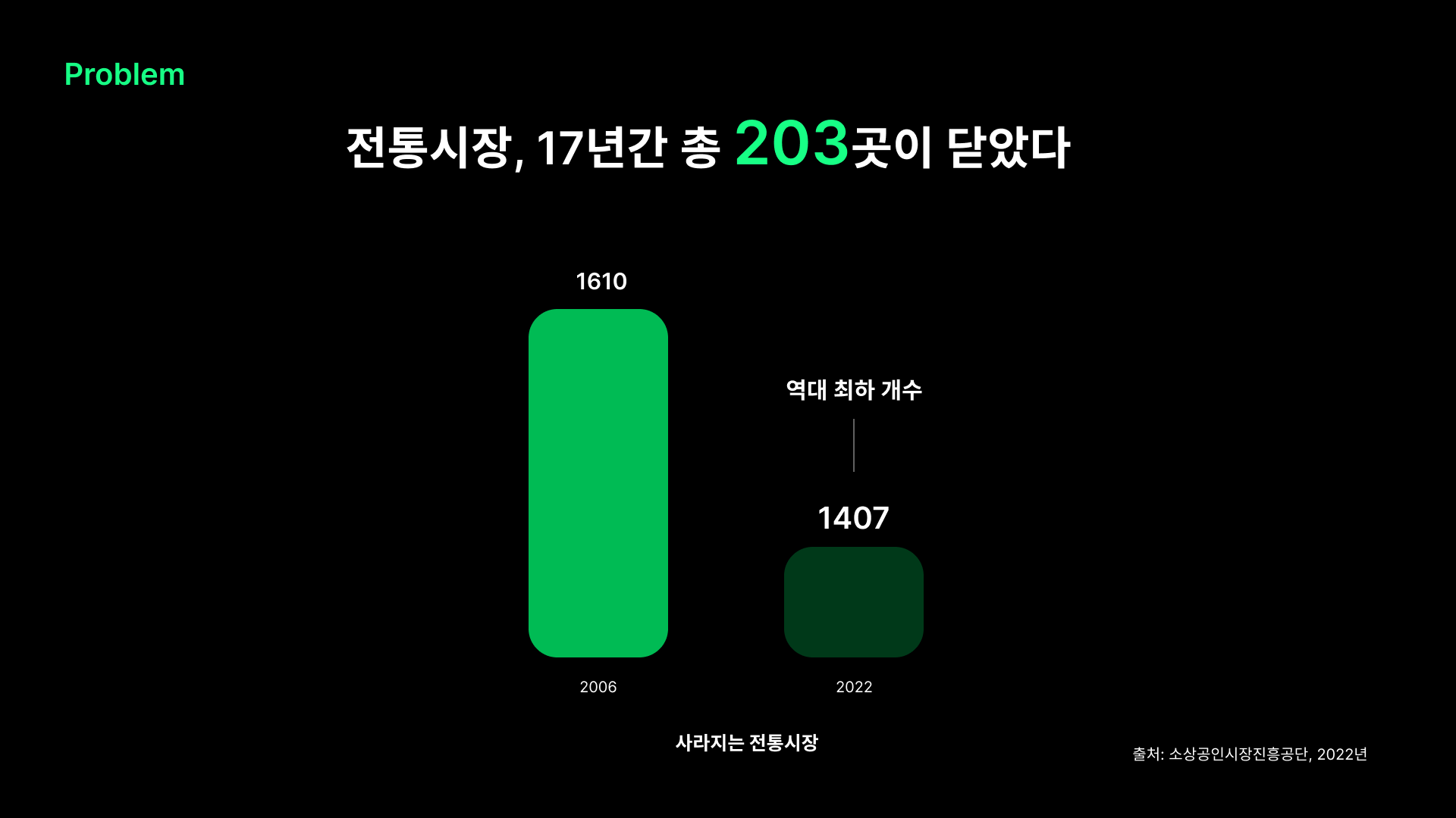 그런데, 지난 17년 동안 우리나라에서는 무려 203곳의 전통시장이 사라졌습니다.