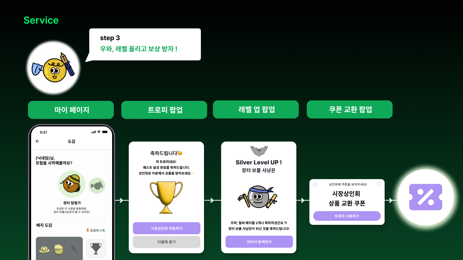 *이때 트로피 부분이나 여러 배지와 캐릭터들을 조금 더 시장의 특색에 맞게, 고도화될 부분이에요!