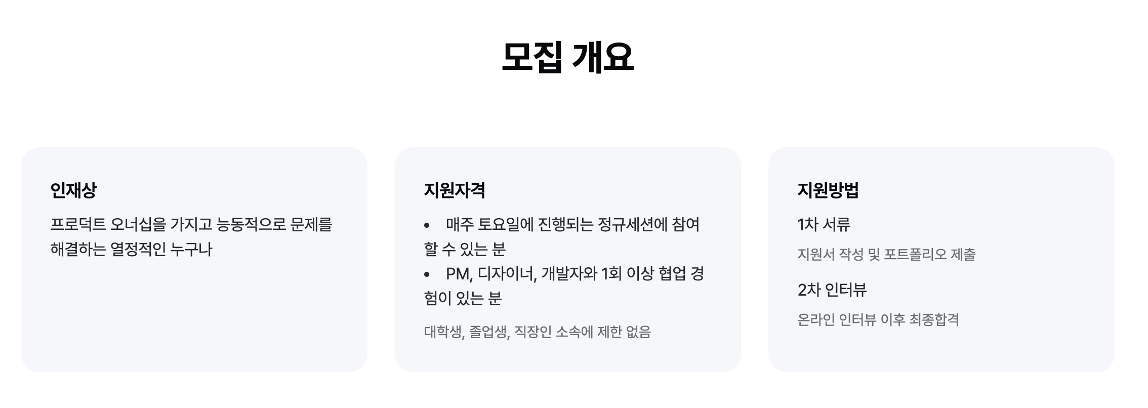 우선, 모집개요는 아래의 사진처럼 파트를 구분하지 않고,