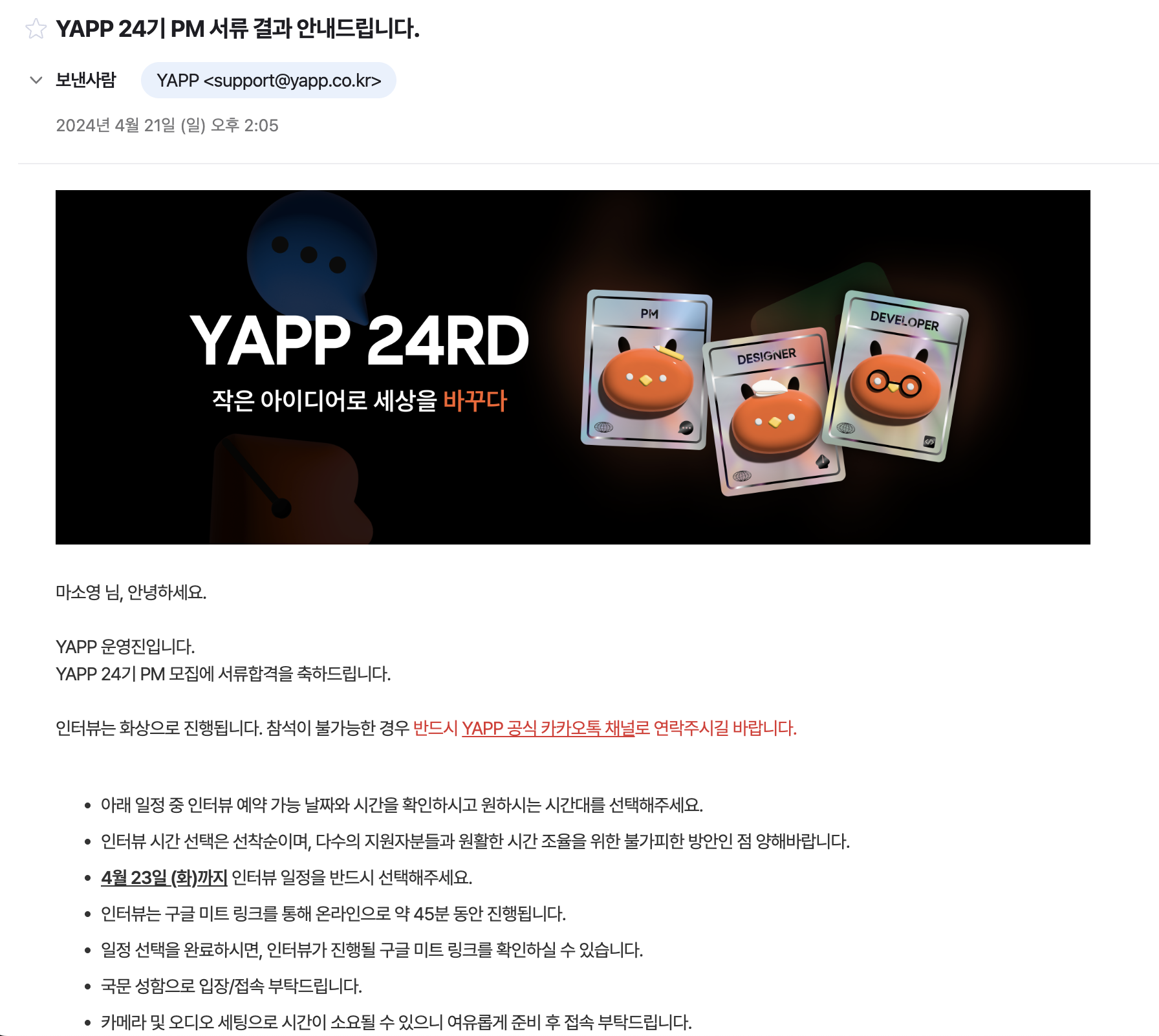 | YAPP 24기 PM 면접/최종합격 후기 (0) | 2024.05.06 |