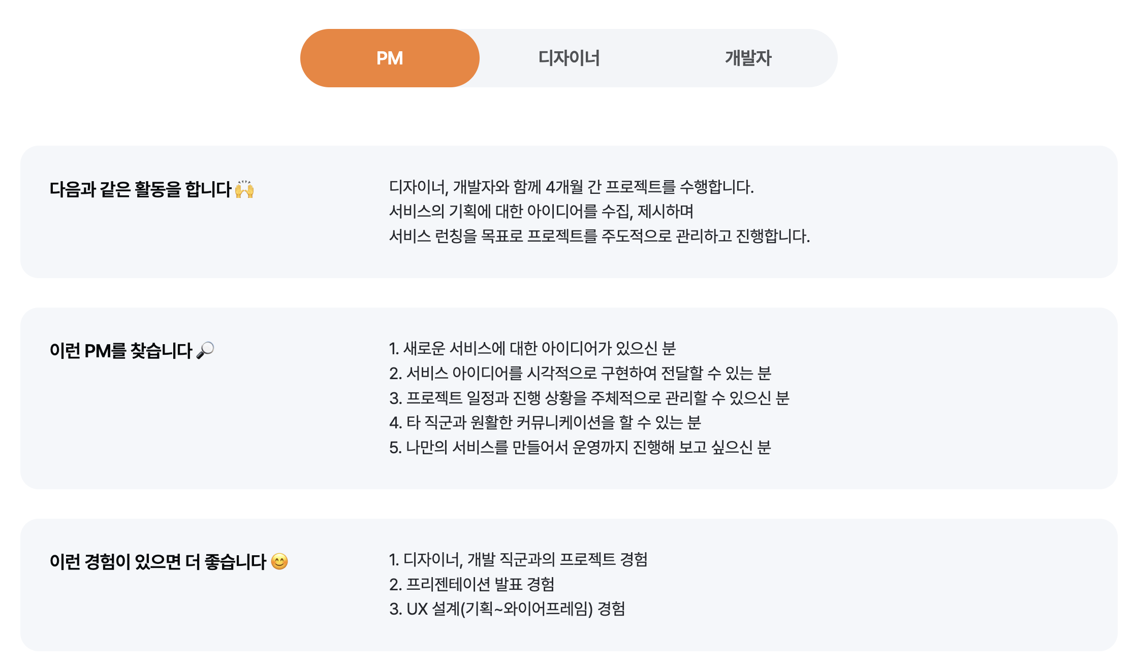 '이런 PM를 찾습니다' 섹션과 '이런 경험이 있으면 더 좋습니다' 섹션인데요,