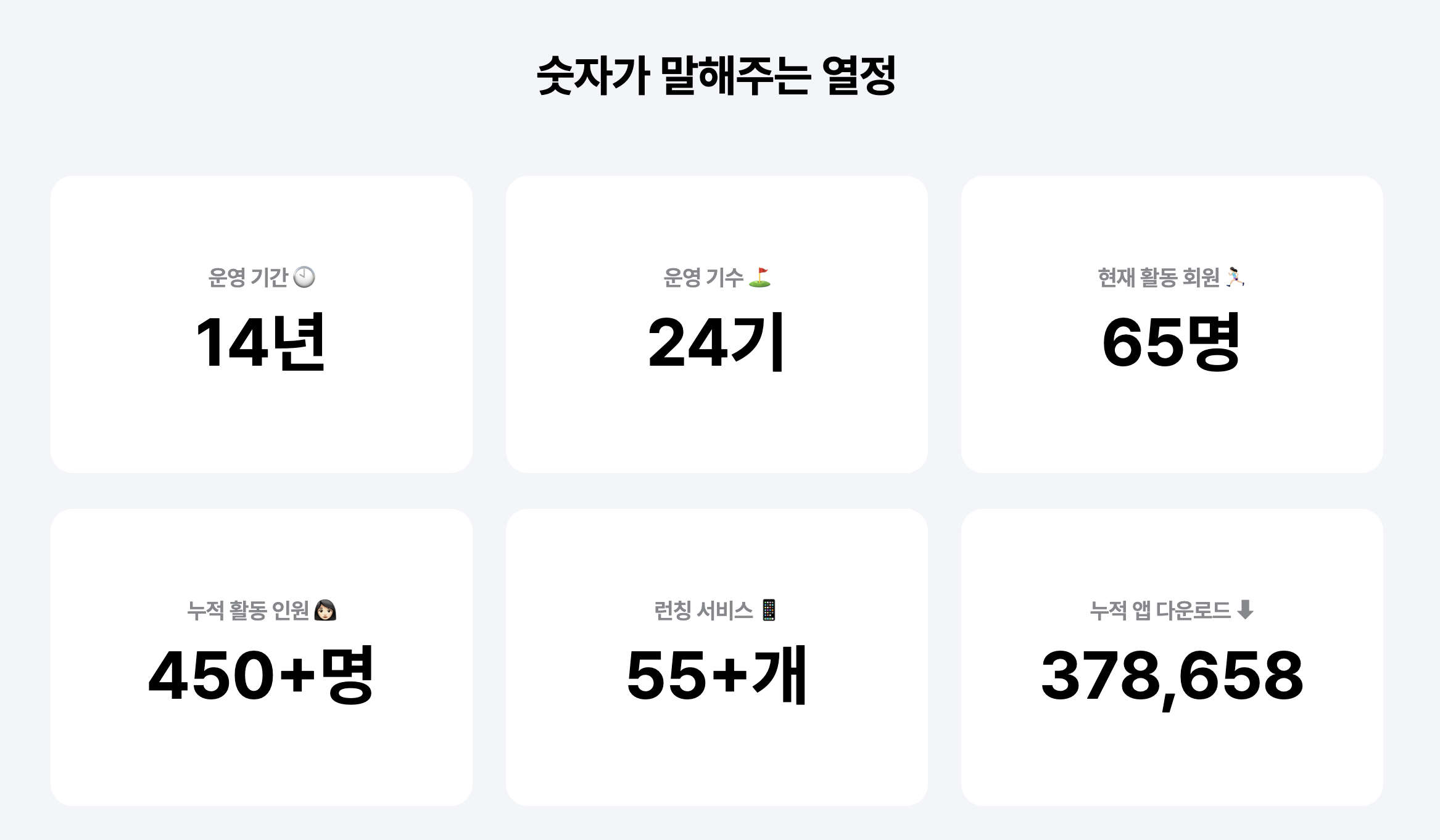 홈페이지를 통해 나와있는 운영기간, 운영기수, 런칭 서비스, 누적 앱 다운로드 수,.. 등을 확인하실 수 있답니다!